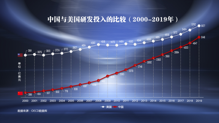 中国现在已经成为仅次于美国的第二大研发投入国。自“十三五”以来,每年保持两位数的高增长,科技创新转化不断成为支撑中国经济发展的强大内生力。