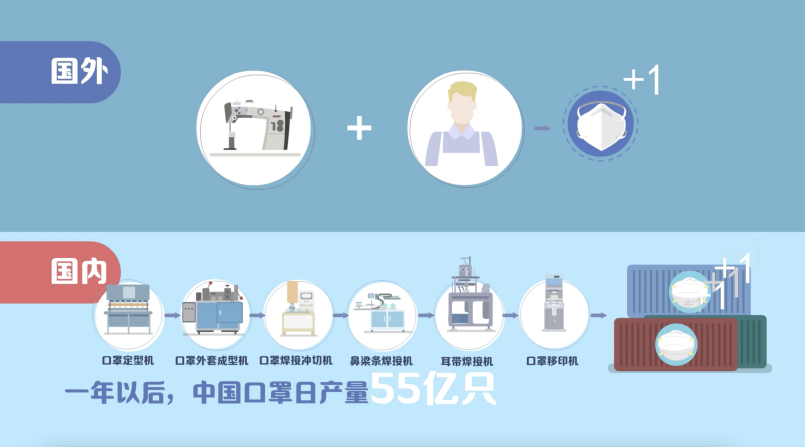 2021年中国经济总量达114.4万亿元,稳居世界第二,占全球经济比重超18%。历经70余年发展,中国经济已经积累了雄厚的物质基础,发展成为全球唯一一个拥有全产业链的国家。片中以口罩的生产,生动演示中国齐全的工业门类,独立完整地成为内循环的基础。