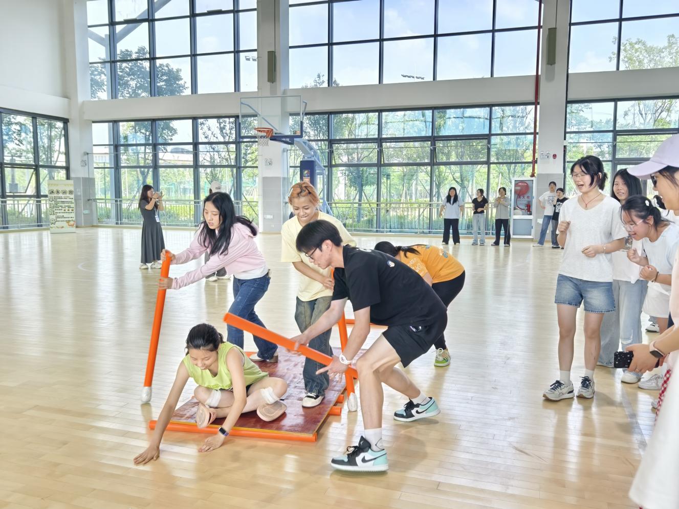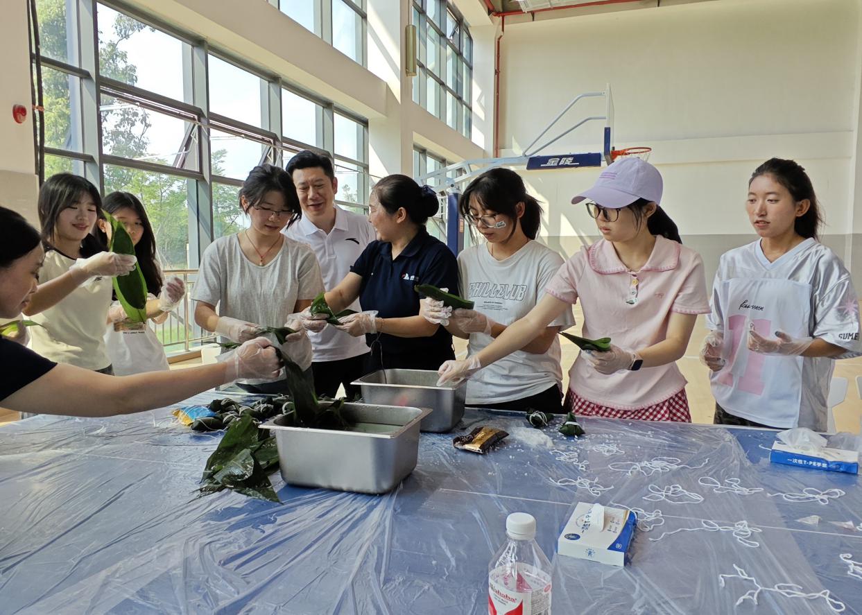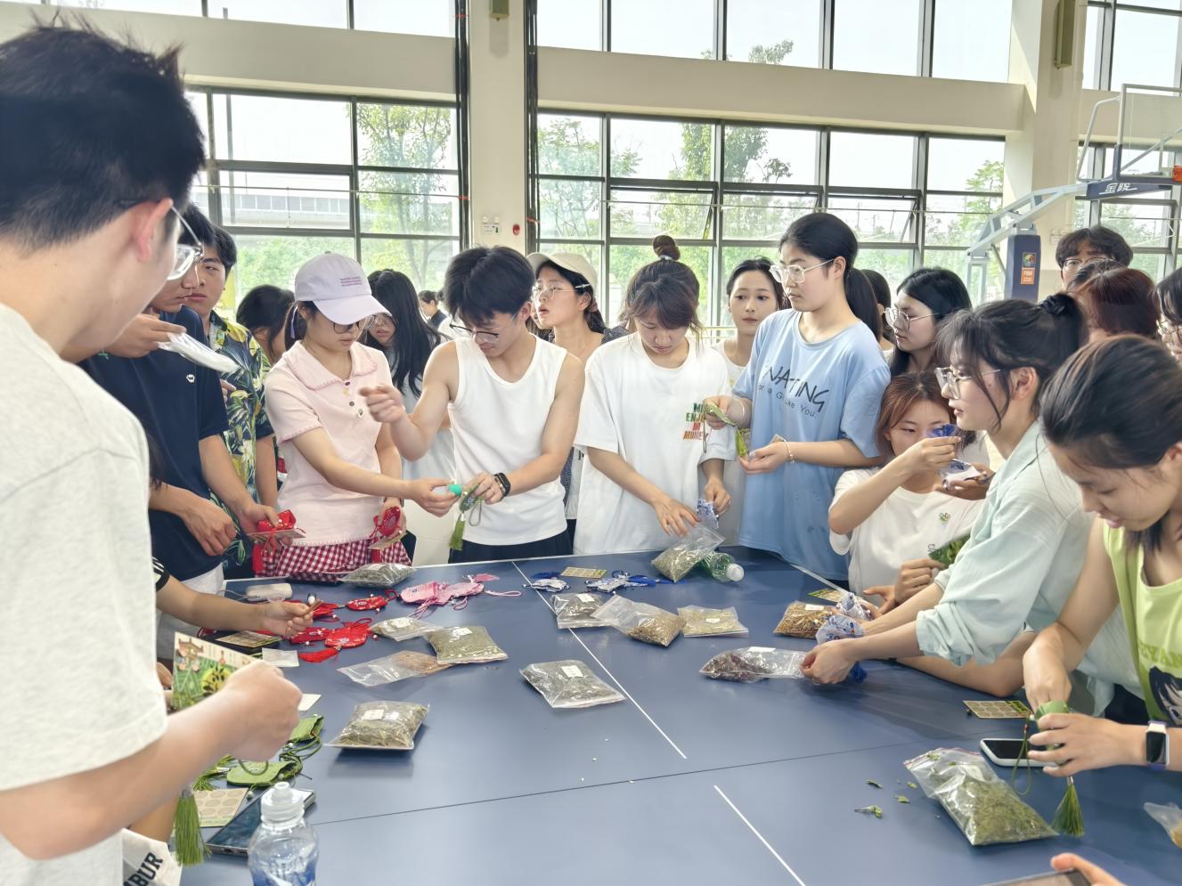现场设多个特色非遗体验区。“旱地龙舟”趣味竞赛率先引爆气氛,同学们全力以赴,奋力冲刺。“粽”享欢乐区,同学们从选叶、填料到捆扎,沉浸式体包粽子。五彩绳编织区,色彩斑斓的丝线在同学们手中穿梭,一根根寓意吉祥的五彩绳随之诞生。香囊制作区香气袭人,承载健康平安祈愿的香囊成为一份独特而充满心意的节日纪念品。“绘彩蛋”区,洁白鸭蛋变身创意画布,一颗颗精心绘制的彩蛋象征新生与希望。此外,现场还设“粽子甜品DIY台”,让大家在动手之余,尽享节日甜蜜。