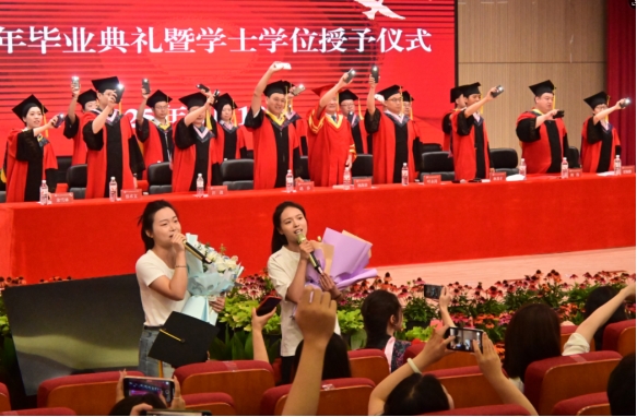 毕业典礼开始前,学校师生代表倾情演唱暖场歌曲《一程山路》《稻香》《起风了》《剩下的盛夏》,悠扬的旋律与校园生活影像同步播放,唱响青春的美好与不舍。