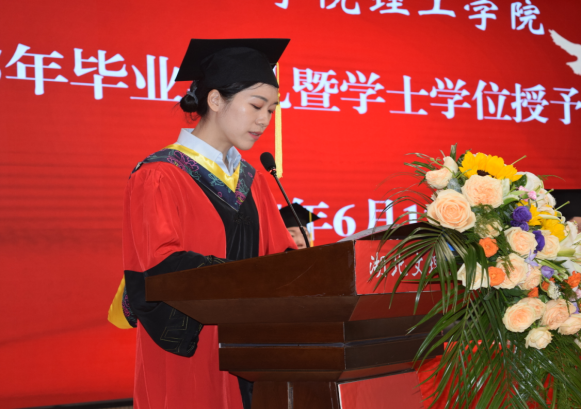 来自电子科学与信息工程学院的闫瑾作为优秀毕业生代表发言。她以“青春、奋斗、逐梦、感恩”为关键词回顾了大学四年的在校时光,向学校、老师、家人致以表示衷心的感谢。她表示,理工学子将带着母校“志存高远、自强笃行”的校训,以青春为帆,以奋斗为桨,在建设社会主义现代化强国的伟大航程中劈波斩浪,勇敢逐梦。