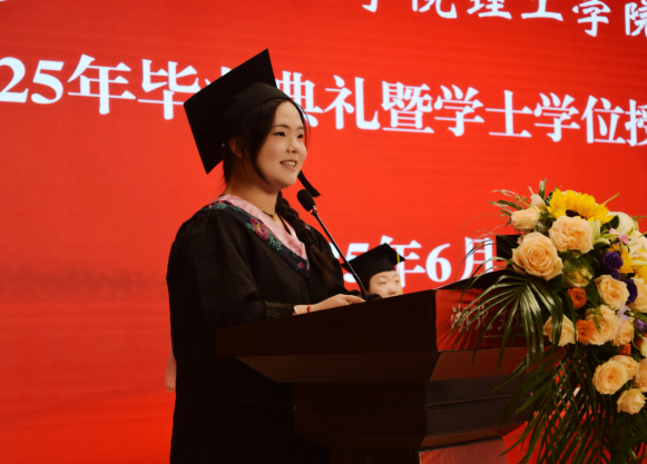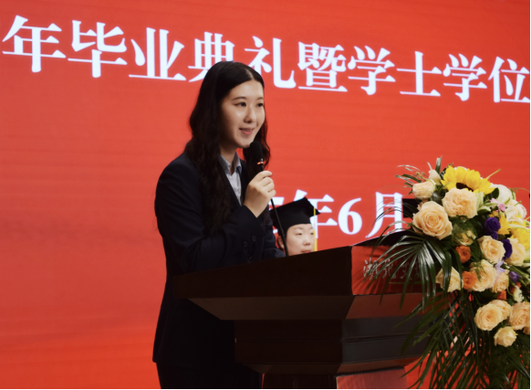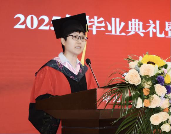 来自经管学院的教师代表张雅妮向毕业生致以寄语与美好的祝愿。她鼓励毕业生们做胸怀星海的赶路人、做不被定义的追光者、做温暖世界的修行者。希望毕业生们既要做仰望星空的梦想家,更要当脚踩泥土的实干者,永远保有对自我的忠诚,不断进取、追求卓越,在人生的舞台上绽放出更加绚丽的光芒。
