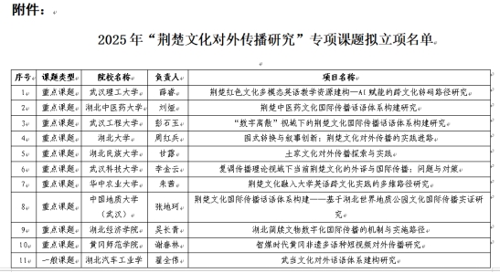 本次课题由湖北省社科联与外语教学与研究出版社联合设立,旨在响应中央及省委省政府关于“增强中华文明传播力影响力”的号召,探索荆楚文化对外传播的创新模式。王娟教授团队聚焦“襄十随神”城市群(襄阳、十堰、随州、神农架)高校资源,结合数字时代传播特征,系统研究地方高校如何通过产教融合、跨学科协作、新媒体技术应用等路径,构建荆楚文化国际化传播体系。课题成果将为湖北文化强省战略提供理论支撑与实践方案。