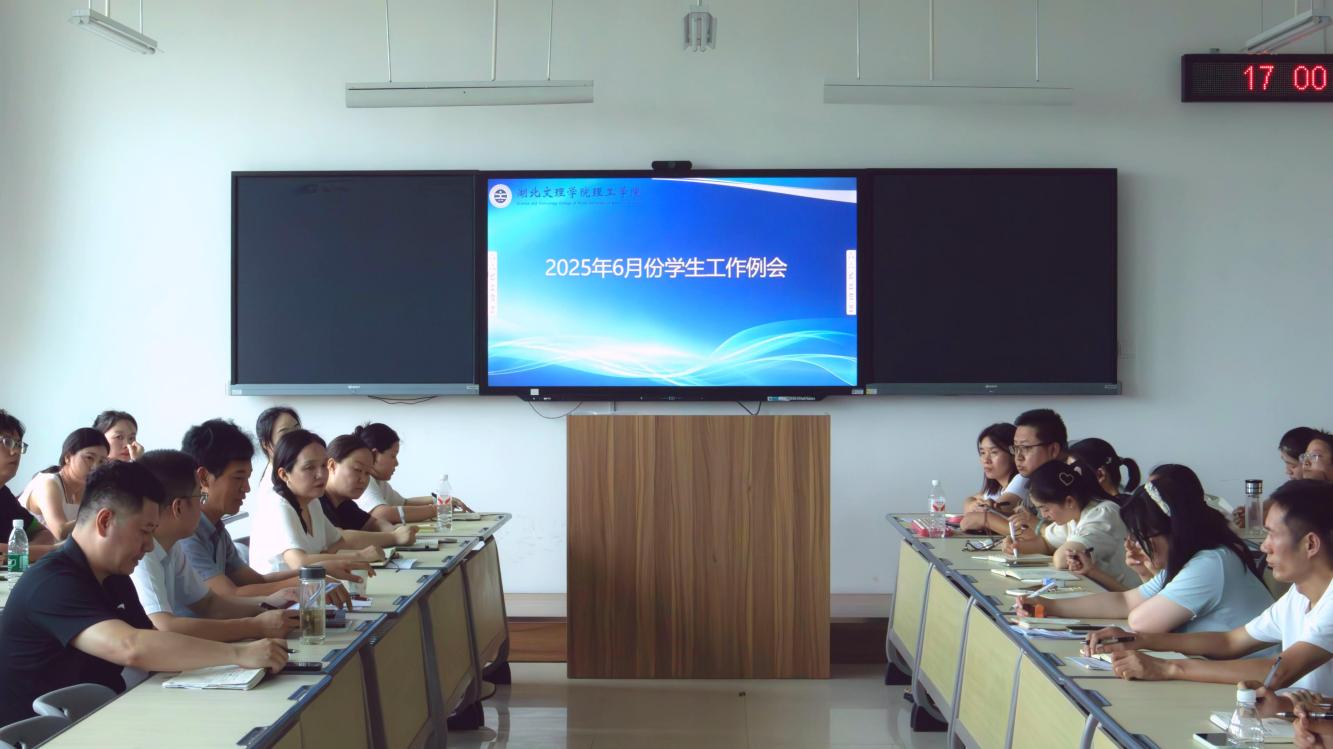 (通讯员 肖慧珍)6月17日下午,学生工作部在1号教学楼405教室召开6月份学生工作例会。副校长耿帮才、各二级学院党总支书记、各二级学院辅导员、学生工作部全体成员参会。会议由学生工作部部长、团委书记宋功成主持。