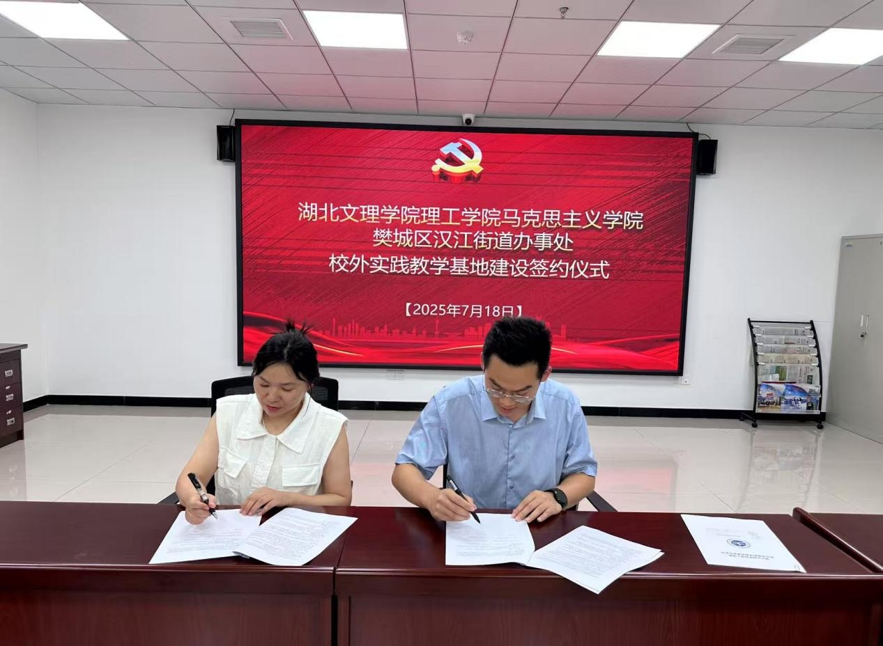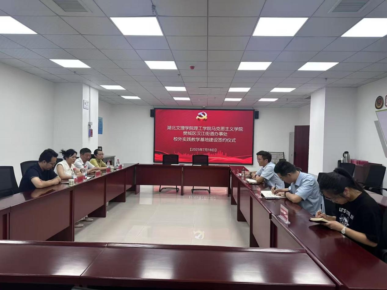 (马克思主义学院 倪鑫杰)7月18日上午,我校马克思主义学院与樊城区汉江街道办事处校外实践教学基地建设签约仪式在汉江街道办事处会议室举行。汉江街道党工委书记万银峰,汉江街道党工委副书记、办事处主任郭旺,汉江街道党工委委员、组织委员、办事处副主任郭文华,汉江街道党建工作办公室主任邓新月,我校马克思主义学院院长刘慧,副院长李明翔,沈年耀教授出席仪式。