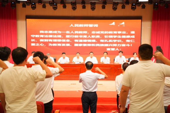 紧接着,在电信学院张佳教授的带领下,新进教师进行集体宣誓。“我志愿成为一名人民教师,忠诚党的教育事业,遵守教育法律法规,履行教书育人职责,引领学生健康成长……”铮铮誓言,表达了新进教师投身教育事业的坚定决心和对教育事业的无限热爱。