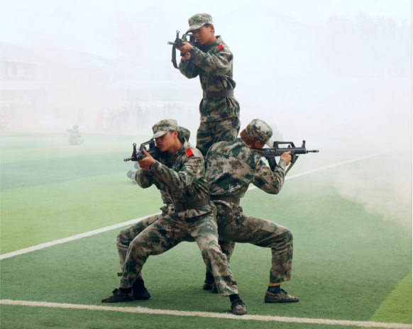 随后依次进行的是标兵班队列表演、捕俘拳、刺杀操、战术操、文艺连表演及爱国歌曲大合唱等表演,赢得了现场师生的阵阵掌声。