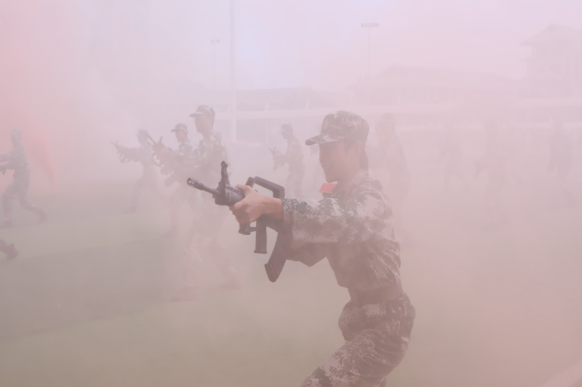 校长杨海浪宣布军训成果汇报正式开始的瞬间,彩烟礼炮腾空而起,形成震撼的彩烟墙,将现场氛围烘托得热烈非凡。