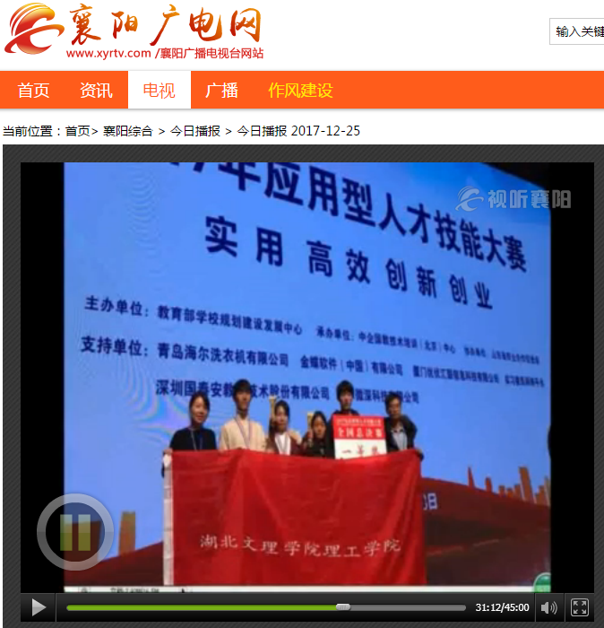 湖北文理学院理工学院何双双同学及其团队设计的“空气能除臭洗鞋烘干机”获得由教育部学校规划建设发展中心主办的2017年应用型人才技能大赛全国总决赛一等奖。获襄阳电视台《今日播报》栏目采访。