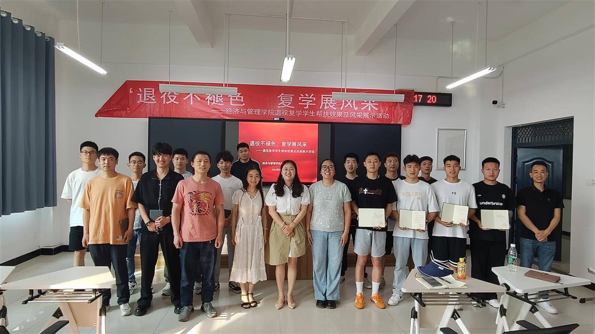 湖北日报讯(通讯员徐丹丹)退役不褪色,复学展风采。5月21日下午,湖北文理学院理工学院经济与管理学院教工党支部开展退役复学学生帮扶效果及风采展示活动,该院20组退役复学学生帮扶小组参与现场展示。