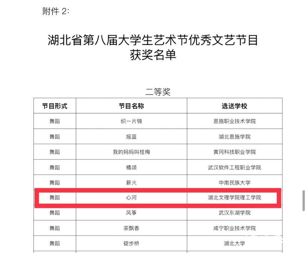以“厚植家国情怀、涵养进取品格”为主题的湖北省第八届大学生艺术节于近期公布了获奖名单,湖北文理学院理工学院学前教育专业选送的舞蹈节目《心河》《拾光》荣获优秀文艺节目舞蹈组二等奖和三等奖。