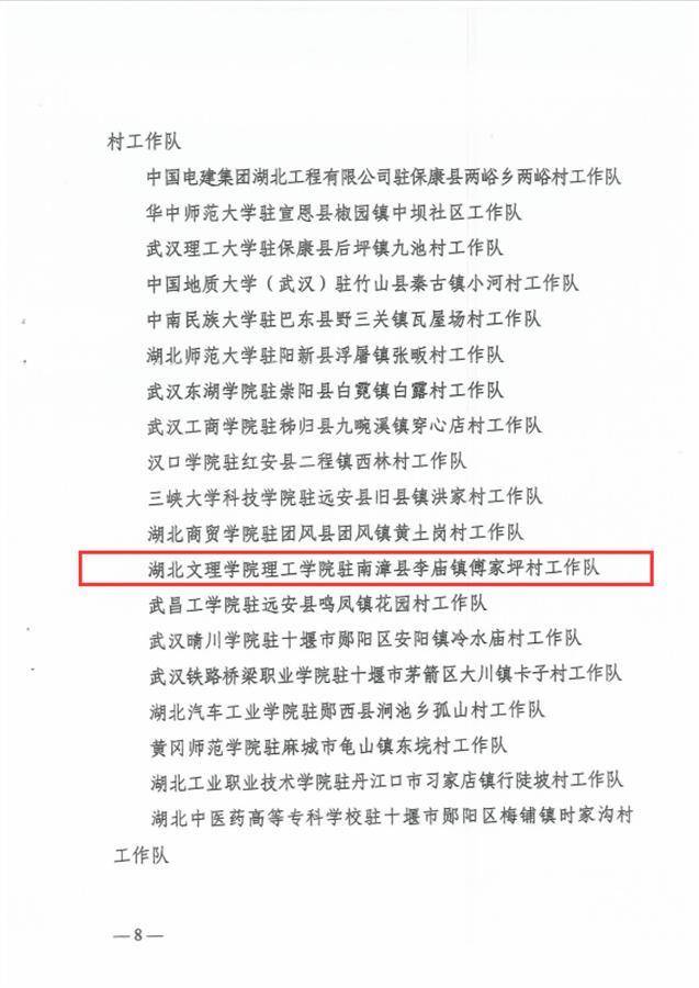 湖北日报讯(通讯员秦晓磊)6月14日从湖北文理学院理工学院获悉,根据省委组织部、省委农办、省农业农村厅《关于表扬2023年度省派驻村工作先进集体和先进个人的通报》(鄂农发〔2024〕21号),该校驻南漳县李庙镇傅家坪村工作队获评湖北省“2023年度工作突出驻村工作队”。