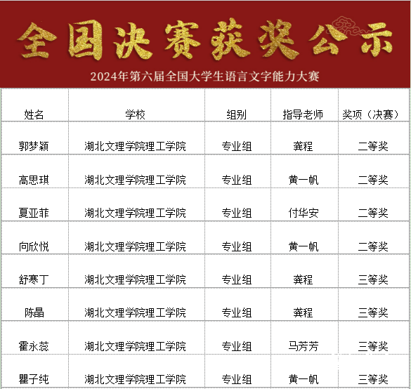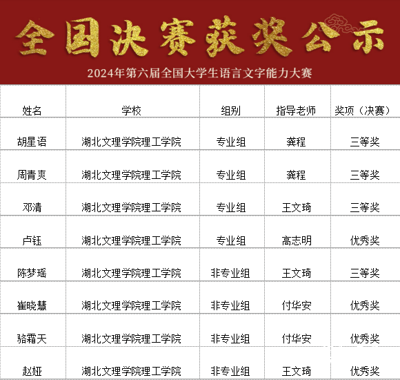 7月20日,2024年第六届全国大学生语言文字能力大赛全国决赛获奖名单公布,湖北文理学院理工学院共有16位学子在本届大赛中获奖,其中,汉语言文学专业郭梦颖、高思琪、夏亚菲、向欣悦等四位同学获得专业组全国二等奖,舒寒丁、陈晶、霍永蕊、胡星语等七位同学获得专业组全国三等奖,卢钰获得专业组全国优秀奖;崔晓慧、骆霜天等四位同学获得非专业组全国三等奖及优秀奖。同时,湖北文理学院理工学院教育学院副院长王文琦获优秀组织者奖、龚程老师获优秀指导教师奖。