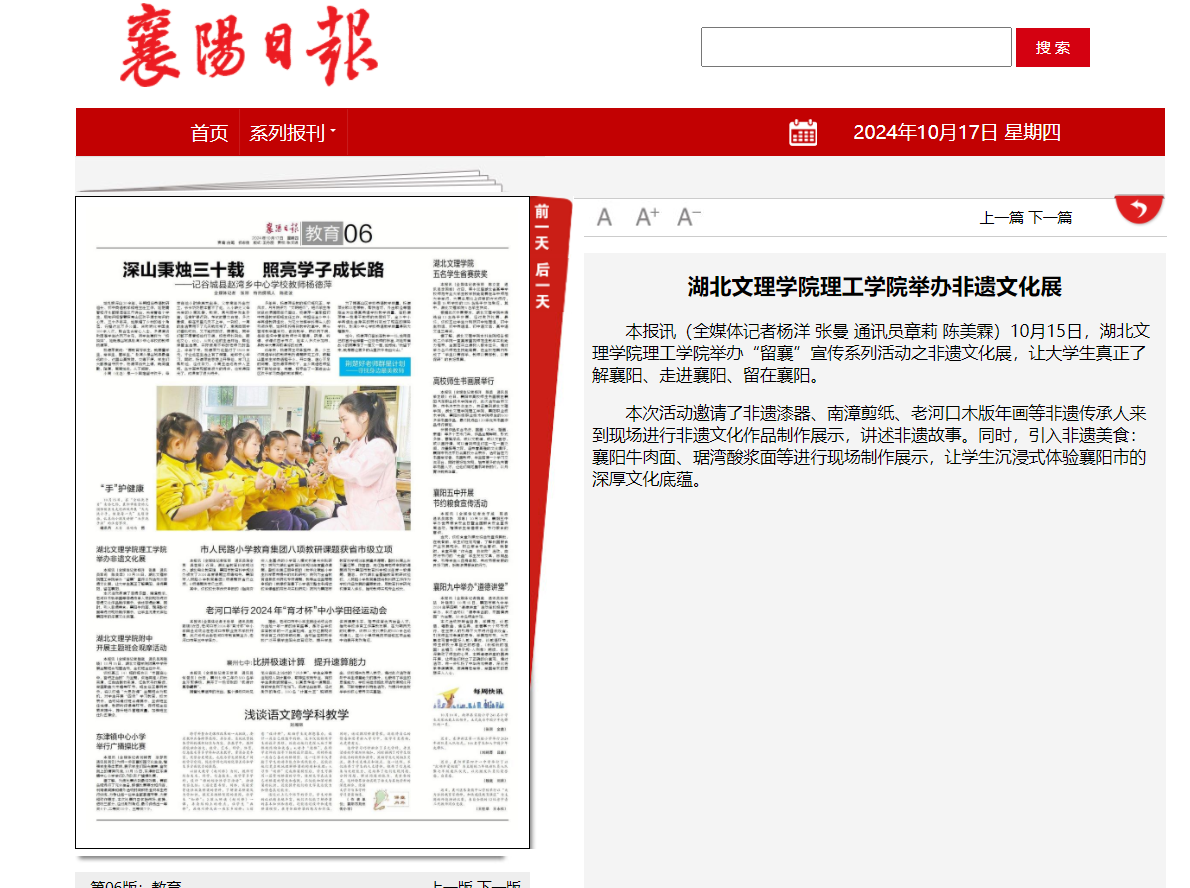本报讯(全媒体记者杨洋张曼 通讯员章莉 陈美霖)10月15日,湖北文理学院理工学院举办“留襄”宣传系列活动之非遗文化展,让大学生真正了解襄阳、走进襄阳、留在襄阳。
