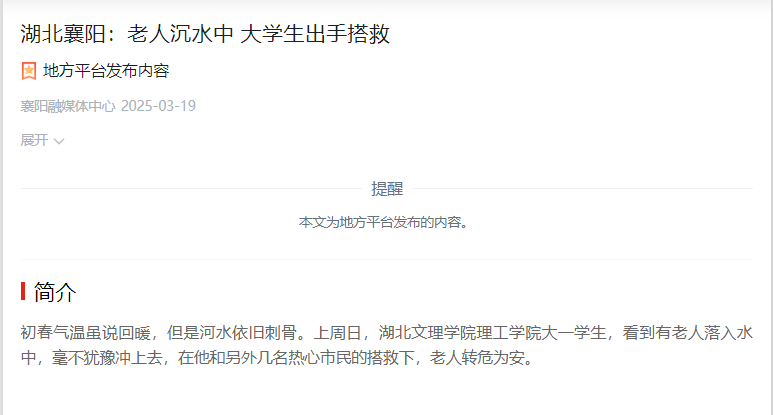 初春气温虽说回暖,但是河水依旧刺骨。上周日,湖北文理学院理工学院大一学生,看到有老人落入水中,毫不犹豫冲上去,在他和另外几名热心市民的搭救下,老人转危为安。