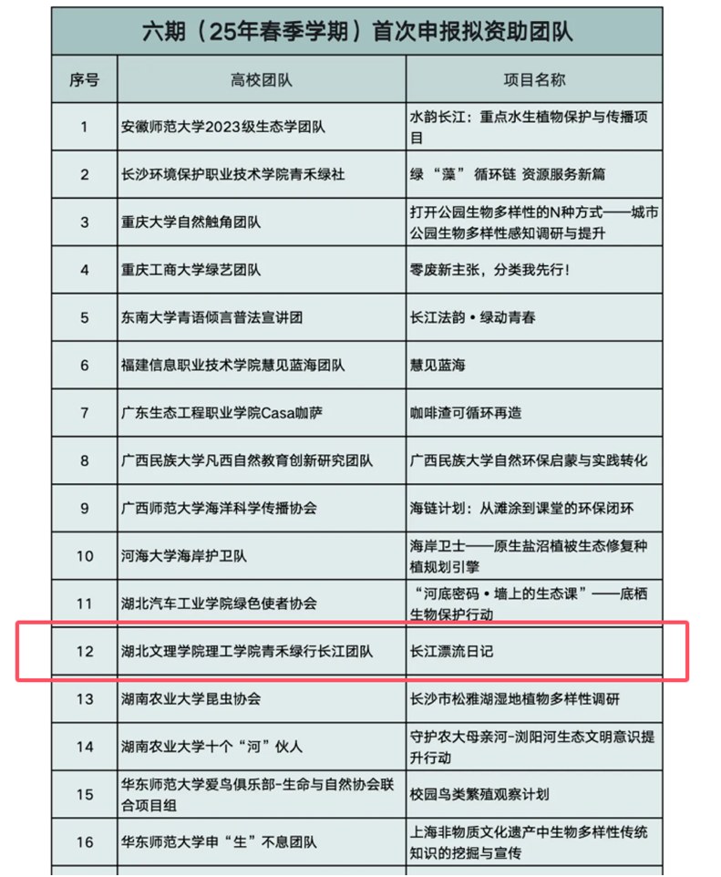 近日,湖北文理学院理工学院青禾绿行长江团队以“长江漂流日记”为题,成功申报涓流行动“一个长江”大学生环保活动资助项目。