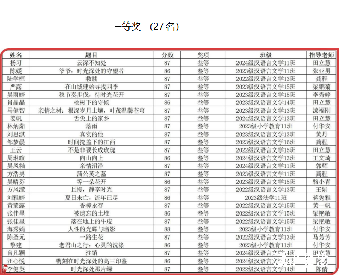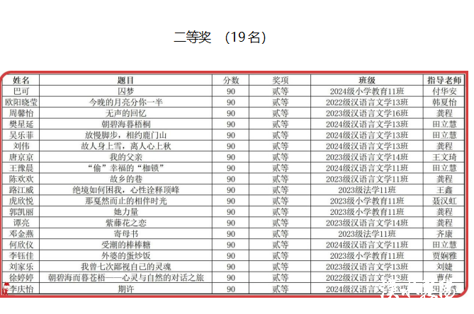 第二十届全国大学生文学作品大赛是中国作协直属的中国诗歌学会指导、湖北省散文学会承办的一项面向全国高校的国家级文学赛事,旨在激发大学生的文学创作热情,发现文学新锐,繁荣校园文化,培育杰出的青年文学爱好者。大赛自2024年10月启动以来,学校领导高度重视,积极联系教育学院和昭明文学社组织参赛,并要求各位指导老师对学生作品悉心指导、认真打磨。