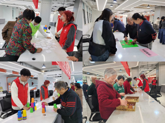 随后的趣味互动环节,社工与志愿者分工协作,设置了彩球归位、彩杯叠叠乐、卡牌对碰三个游戏摊位。在彩球归位游戏中,志愿者协助老人完成颜色分类任务,锻炼反应能力;彩杯叠叠乐环节,居民根据卡片提示精准摆放杯子,既动手又动脑,有效缓解心理压力;卡牌对碰游戏则以汉字偏旁拼字为主,志愿者与居民组队互动,既增添了文化趣味,也促进了邻里交流,现场气氛热烈、笑声不断。